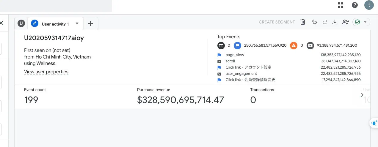 If you click on the User ID, you can have an overview of this user’s activity on your website.